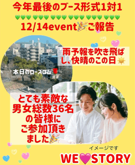 2025/12/14今年最後のブース形式1対1イベント🎉お天気にも恵まれ、素敵な男女36名にご参加いただきました✨カップルもたくさん誕生し、良い締めくくりとなりました❣️おめでとうございます🎊