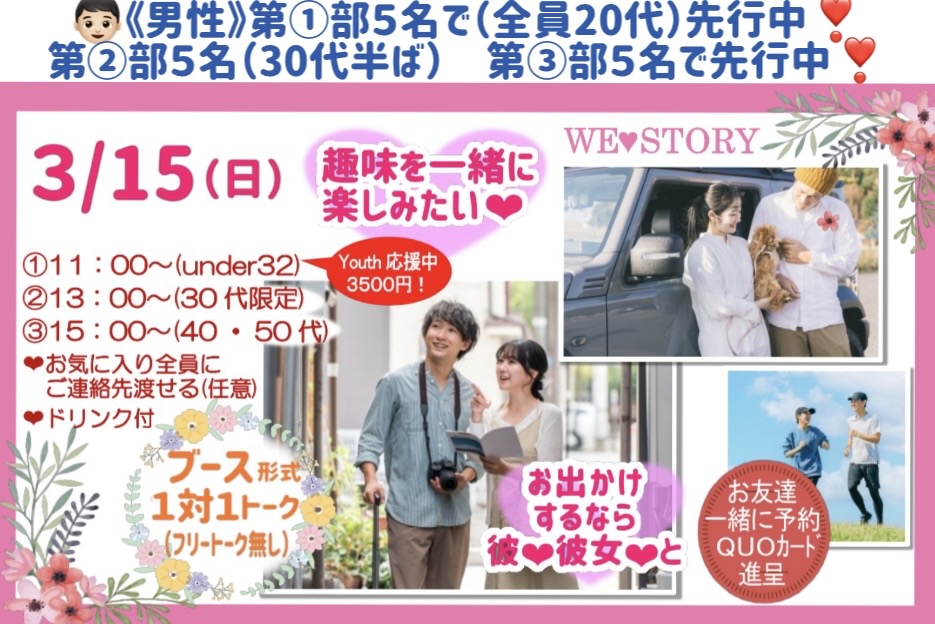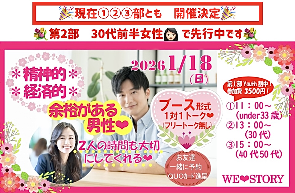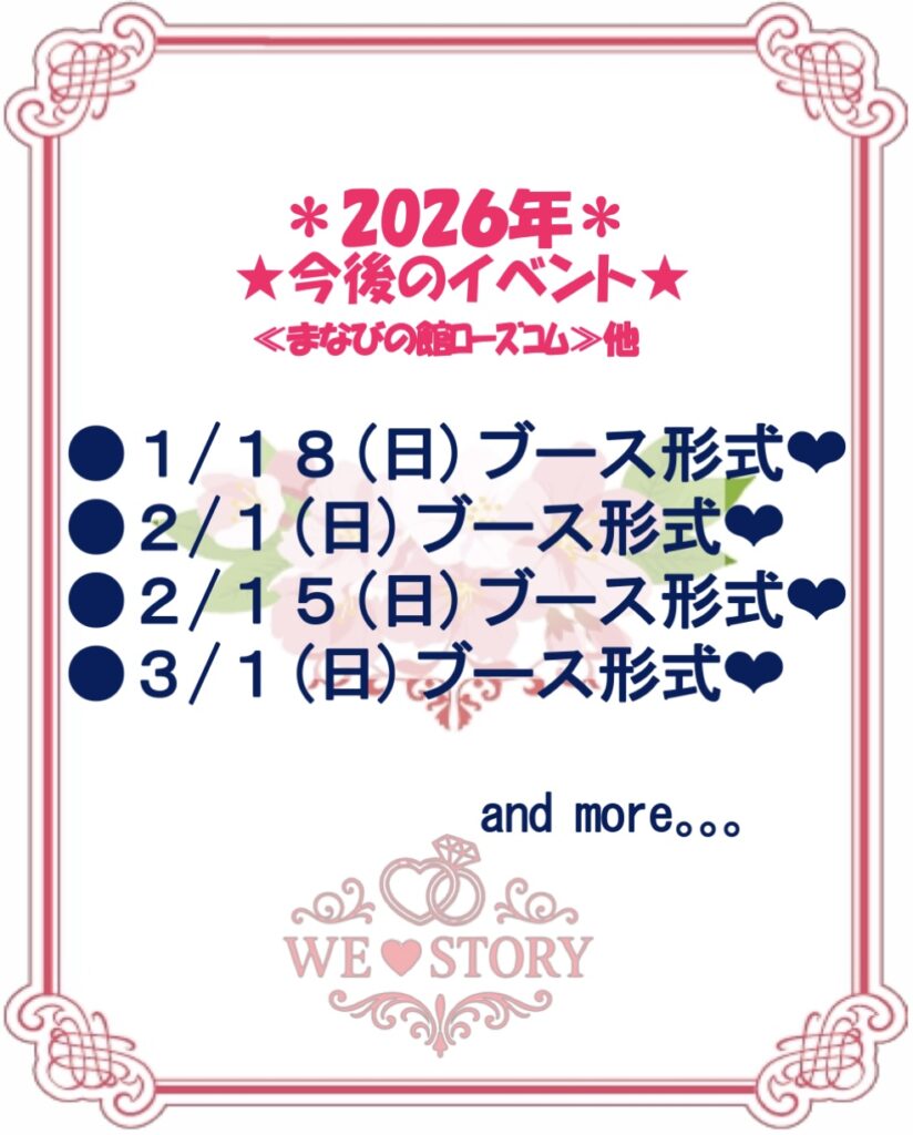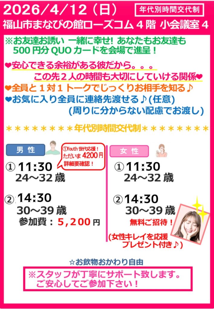 ❤今後のイベント❤ ※2026年、初event★今年こそは決めたい! ※2人でたくさん思い出づくり❤︎ 開催日時 第2部、男性あと1名ご予約で、女性受付再開です❣️ ❤1月18日(日) 【開催場所】福山市まなびの館ローズコム 【お一人安心】毎回圧倒的お一人参加多数です☆ 気になった方全員に連絡先渡せる(注:必ず渡さないといけない訳ではありません) 今回の会場は≪小会議室3≫です!お間違えの無いようお気をつけ下さい! 開催日時 ❤2月1日(日) 【開催場所】福山市まなびの館ローズコム 【お一人安心】毎回圧倒的お一人参加多数です☆