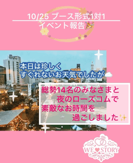2025/10/25本日はあいにくのお天気でしたが…素敵な男女14名のみなさまにお越しいただき、曇り空も吹き飛ぶ1日となりました✨素敵なカップル誕生しました👫