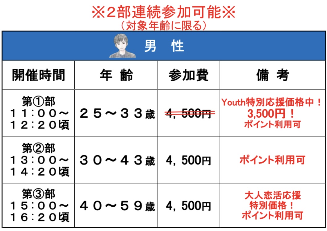 ※最少開催人数 男性3名×女性3名以上で開催決定とさせていただきます。(第③部は男性2名×女性2名以上で開催決定とさせていただきます。)