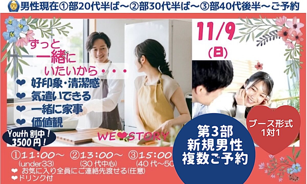 ※最少開催人数 男性3名✖️女性3名以上で開催決定とさせていただきます。(第③部は男性2名✖️女性2名以上で開催決定とさせていただきます。)