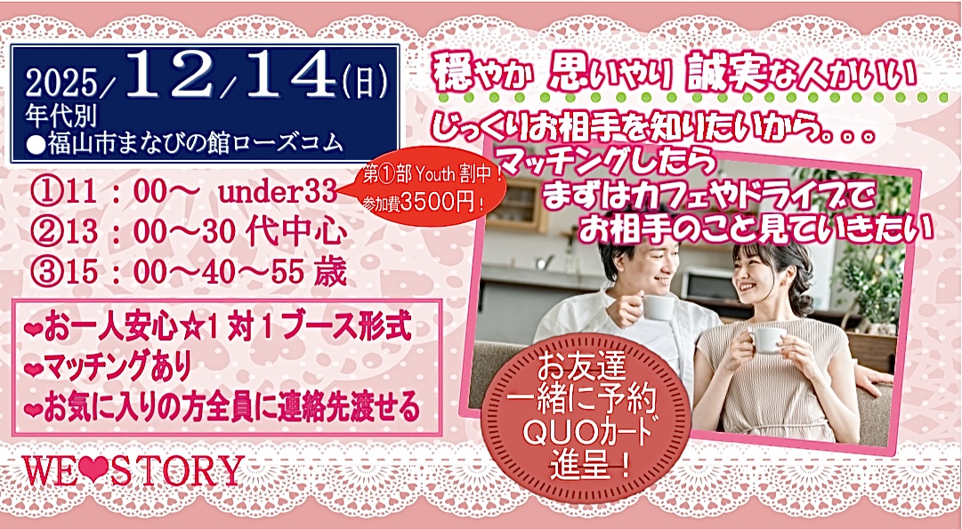 【WE❤STORY】ではお一人参加はもちろん、お友達とご一緒にご参加も、お待ちしております! お友達をお誘いして頂きお友達もご参加いただいた場合、お友達のご予約もご一緒にお申込みしてくださった方に《500円分》のQUOカード、またはスターバックスカードを当日進呈いたします!