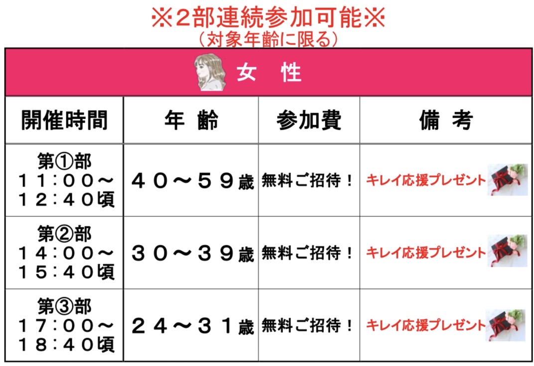 ※最少開催人数 男性3名×女性3名以上で開催決定とさせていただきます。(第③部は男性2名×女性2名以上で開催決定とさせていただきます。)