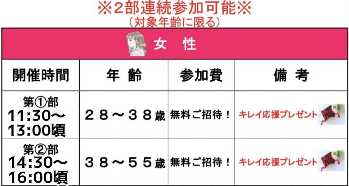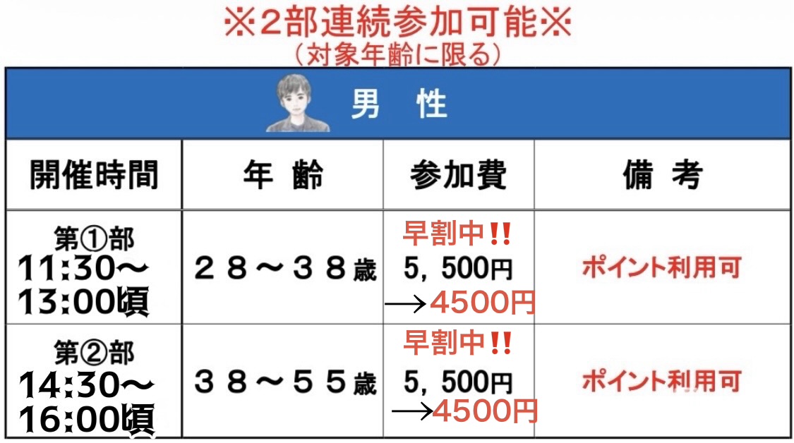 ※最少開催人数 男性3名×女性3名以上で開催決定とさせていただきます。(第②部は男性2名×女性2名以上で開催決定とさせていただきます。)