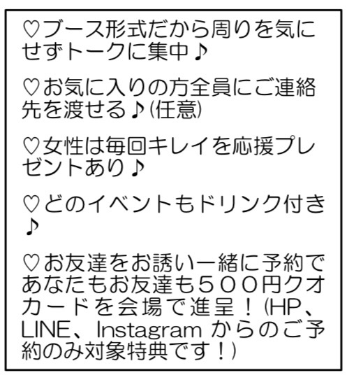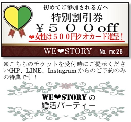 【WE❤STORY】初めての方プレゼント♪ この画面を受付時にご提示ください(HP,LINE,Instagramからのご予約のみの特典です!) 男性 → 受付時ご参加費から割引! 女性 → 500円クオカードをその場でプレゼント! インスタやブログでも情報発信中♪